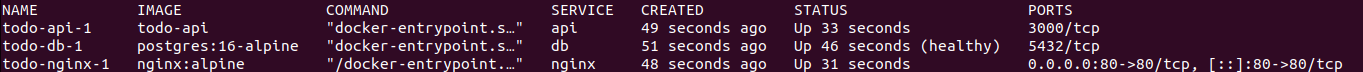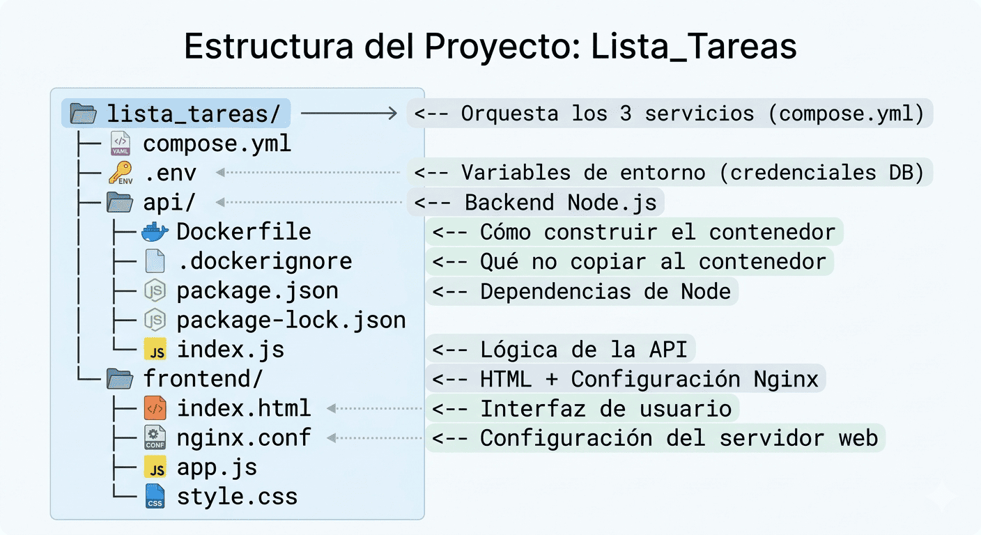 api-> backend con Node.js con Express que expone la API REST - db-> PostgreSQL guarda las tareas de forma persistente