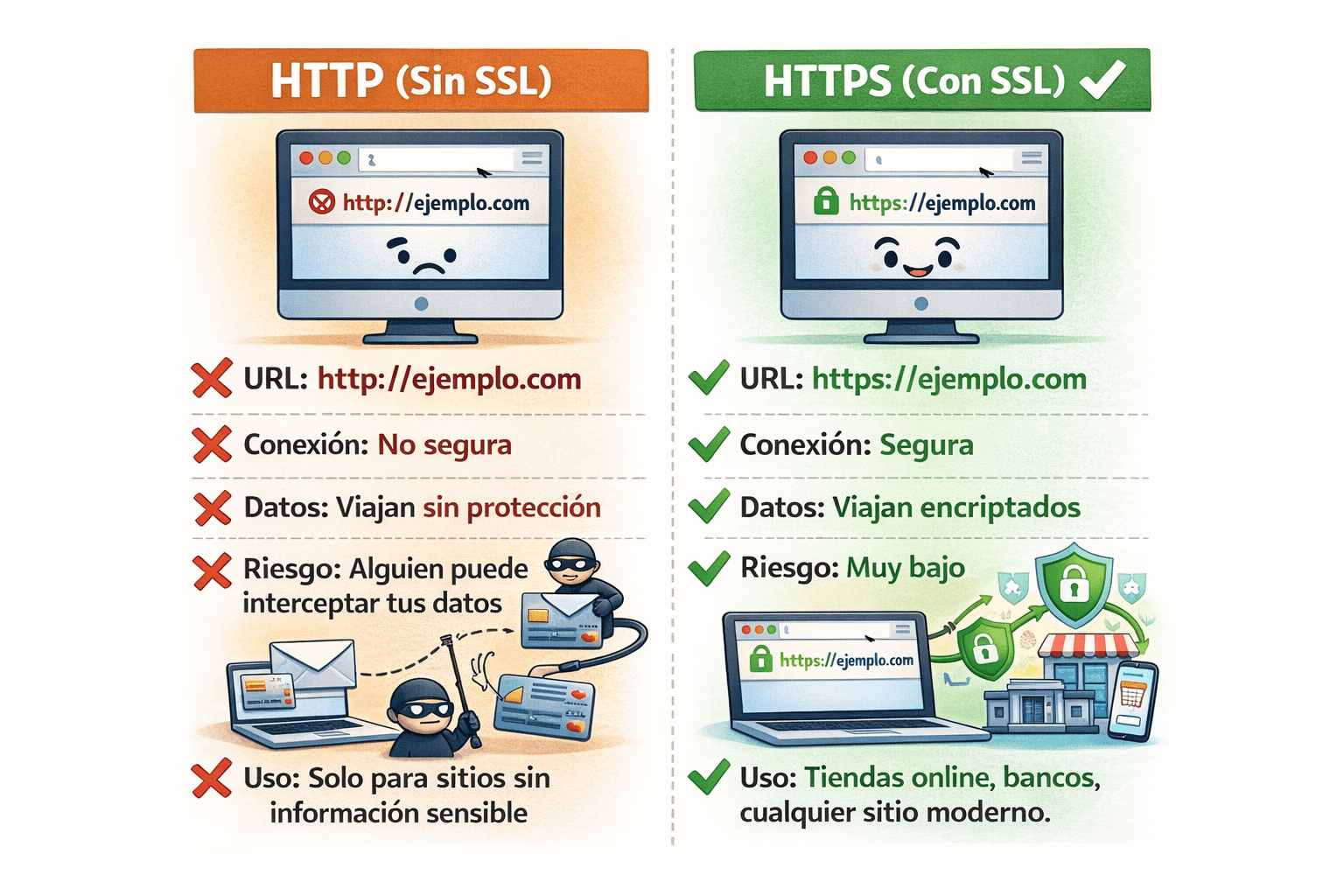 SSL es lo que hace que tu conexión a un sitio web sea segura. Sin SSL, tus datos (contraseñas, números de tarjeta, información personal) viajan por internet sin protección, como si enviaras una postal sin sobre.
