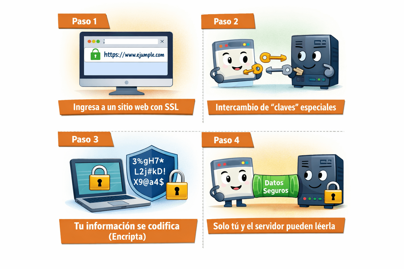 Imagina que SSL es un sobre cerrado.Sin SSL, tu información es como una carta que cualquiera puede leer.Con SSL,tu información está dentro de un sobre cerrado que solo el destinatario puede abrir y leer.